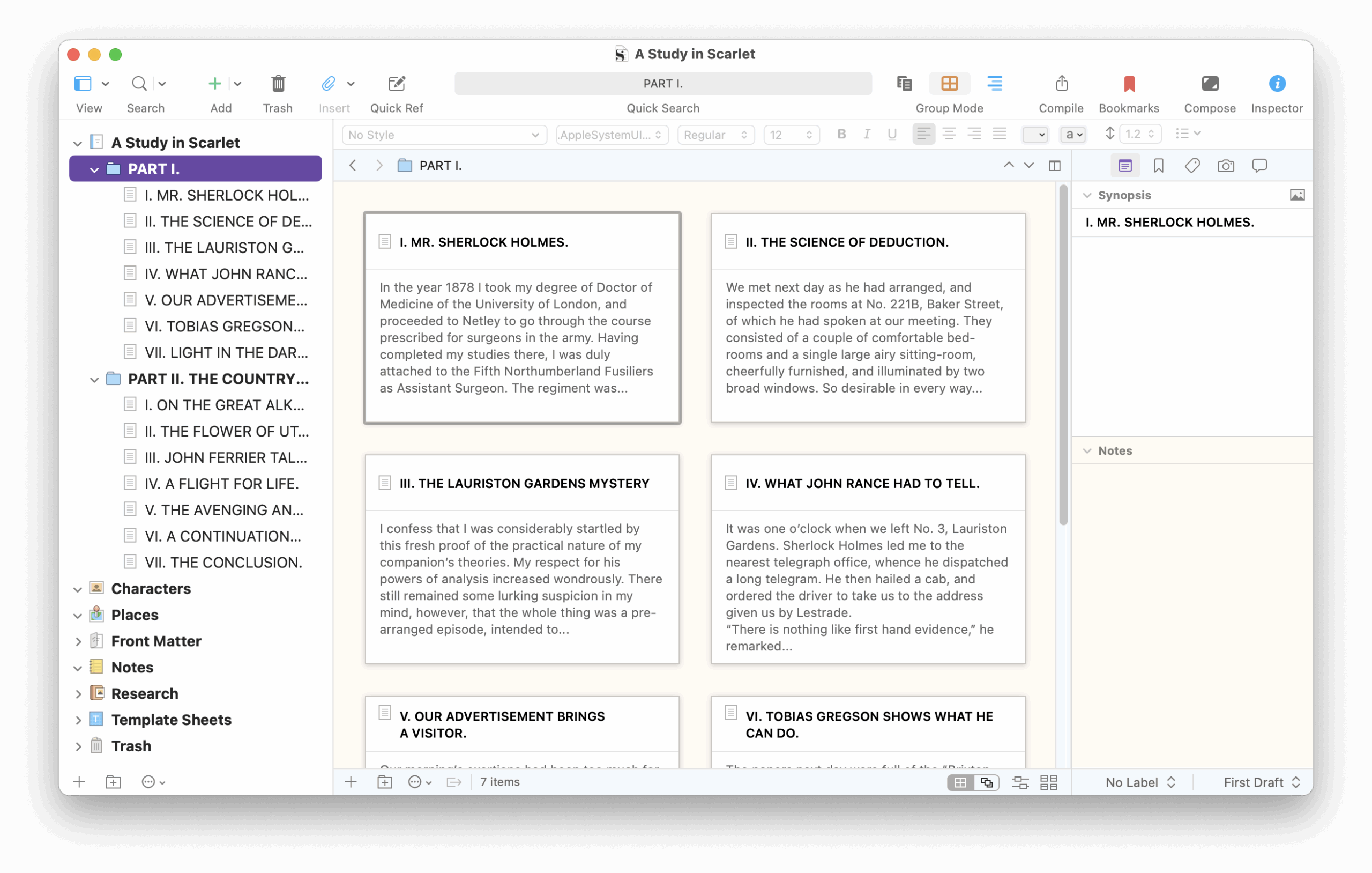 1. Write a synopsis. This may seem obvious, but writing a synopsis in this field also populates the synopsis section of index cards in the Corkboard, as well as notes in the Outliner. When you fill in the Synopsis section in any of these, you can switch views and still see the synopsis. This is extremely practical if you’re outlining or planning a project. See Integrating Scrivener’s Binder, Corkboard, and Outliner to learn how the three views work.