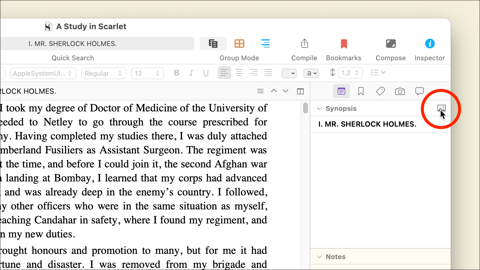 (If you don’t see the Inspector, choose View > Show Inspector, or click the Inspector button in the toolbar. See Get to Know the Scrivener Inspector to learn how to use the Inspector.)
