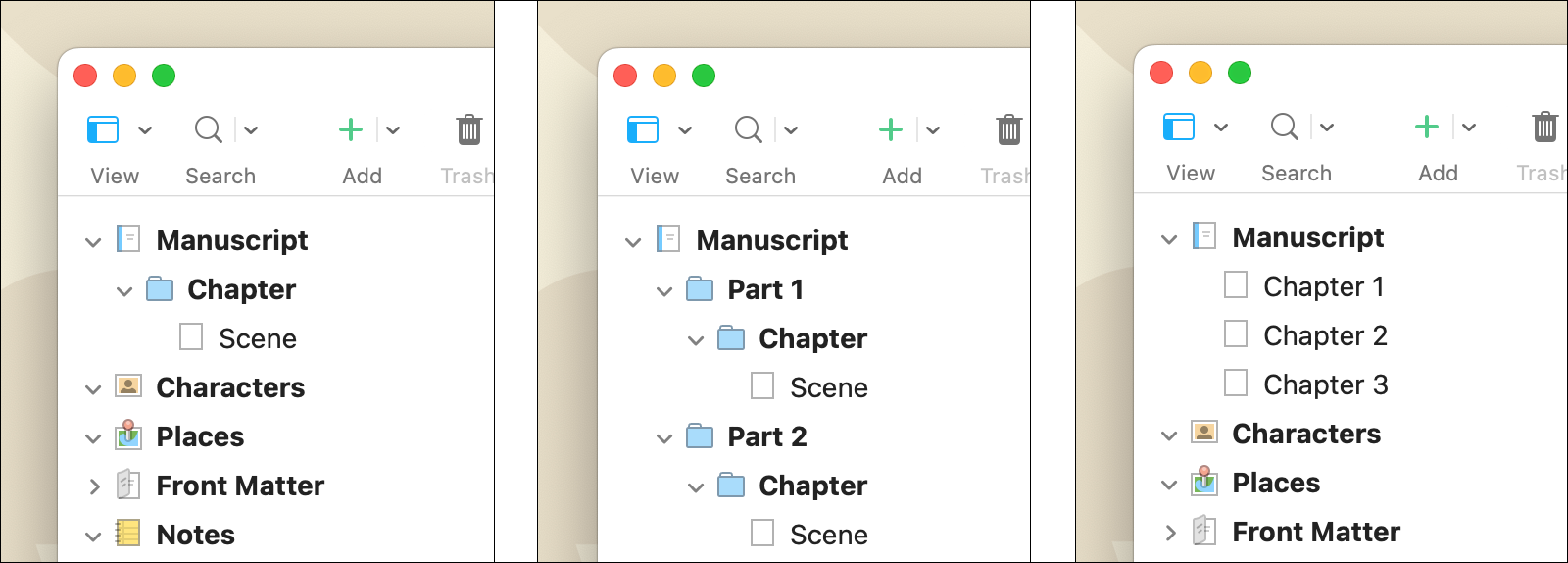 In Different Ways of Setting Up Scrivener’s Binder for Your Projects, we discuss various ways of setting up the Binder for your project, and the first three examples are the most practical for most uses. From left to right, these show the Novel template, the Novel with Parts template, and the Blank template when first created.