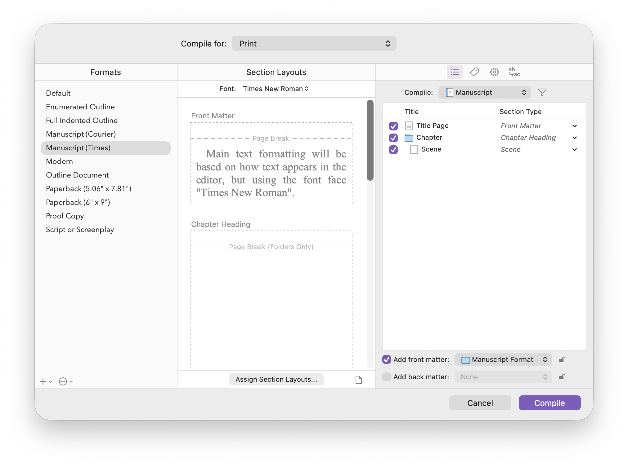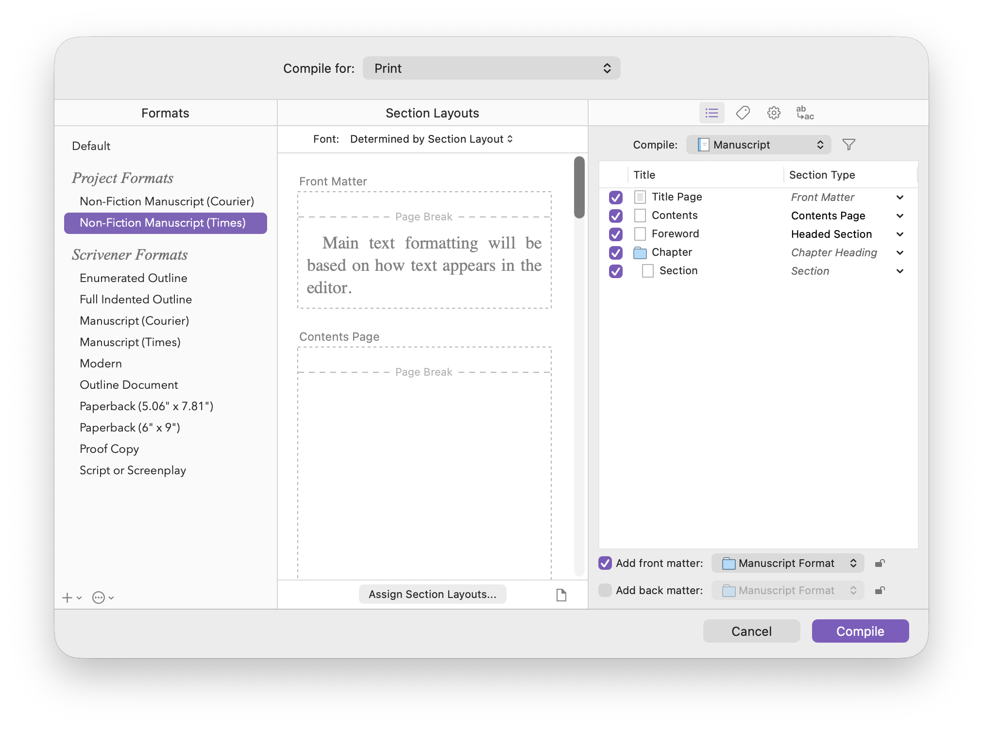 For more on section types and section layouts, see Using Section Layouts to Compile Your Scrivener Project.