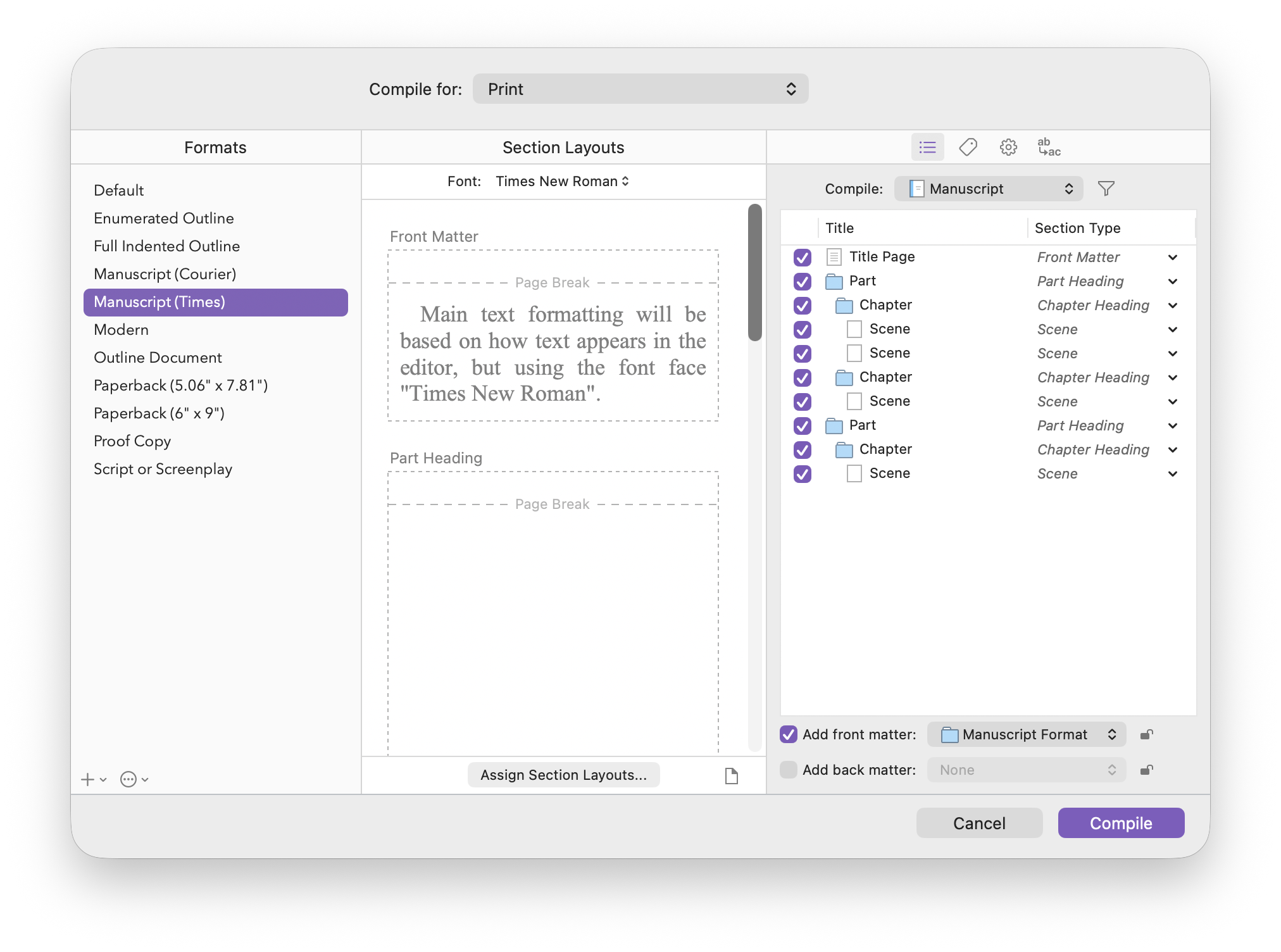 Projects created from different templates provide different options in the Compile Options column. Here’s the Compile Overview screen for the Novel in Parts template; it adds a Part Heading section type in the Compile Options column: