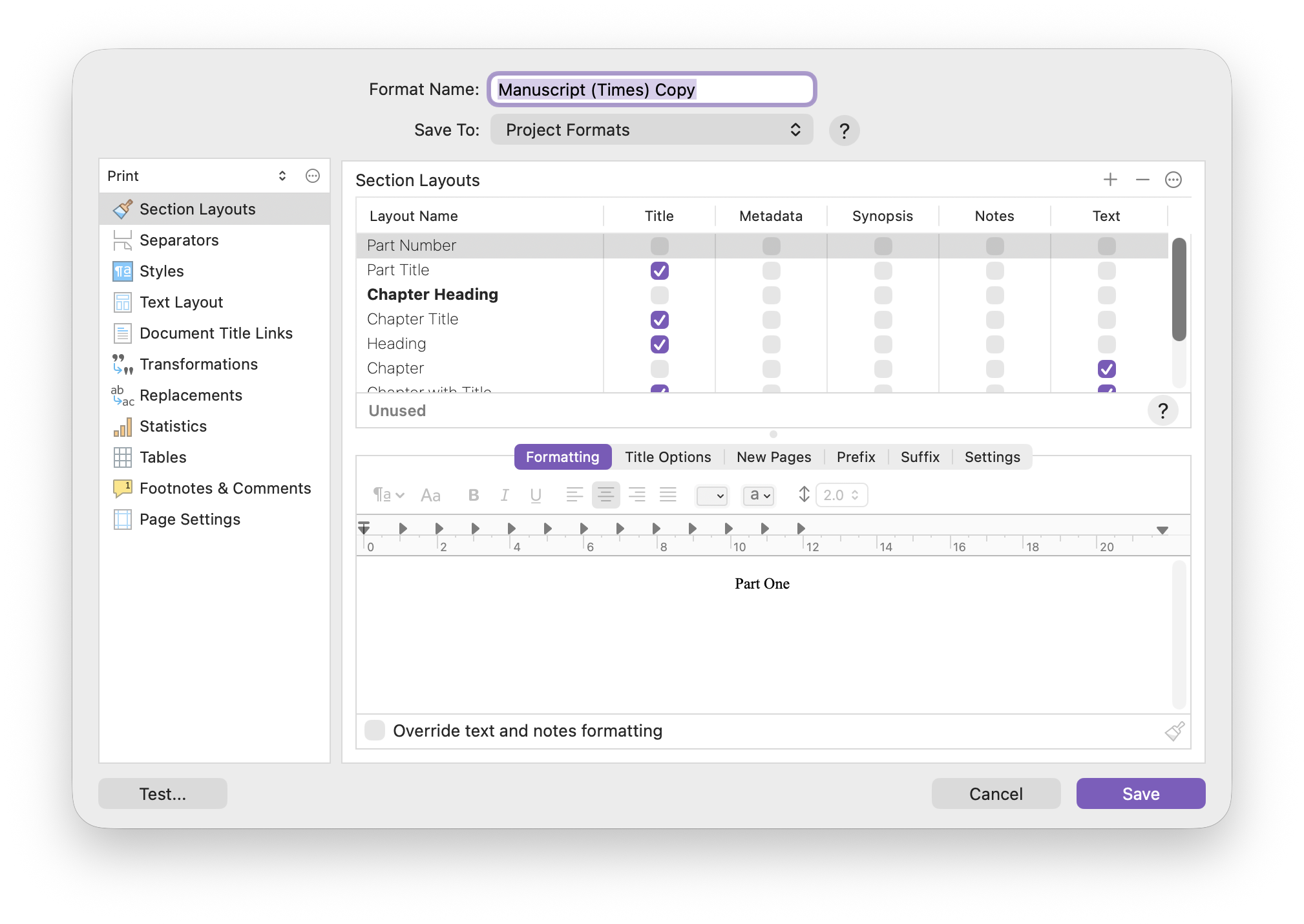 Note that these section layouts override any formatting you have made to your text within Scrivener. This means that you can use very different formatting while you’re writing, revising, and editing from what you eventually export. You can, however, use the As-Is section type if you want to retain your formatting as it displays in Scrivener.