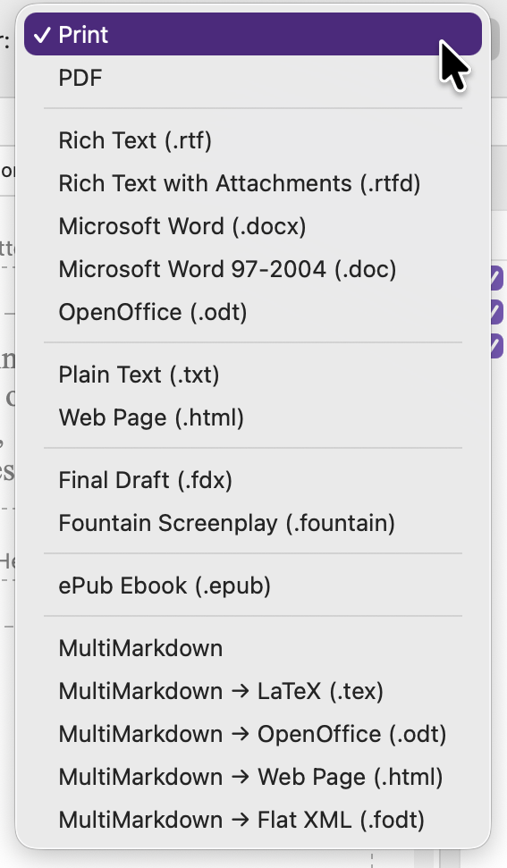 Choose your format from this menu. Scrivener asks you to name the file it exports, then it creates the file. In the Save dialog, there is an option to have Scrivener open the compiled document after saving; if you have more than one app on your computer that can open that type of file, you can choose which app the file opens in.