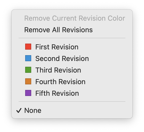 To turn on revision mode, choose Format > Revision Mode, then choose a revision level. You’ll see this dialog when you enable this feature.