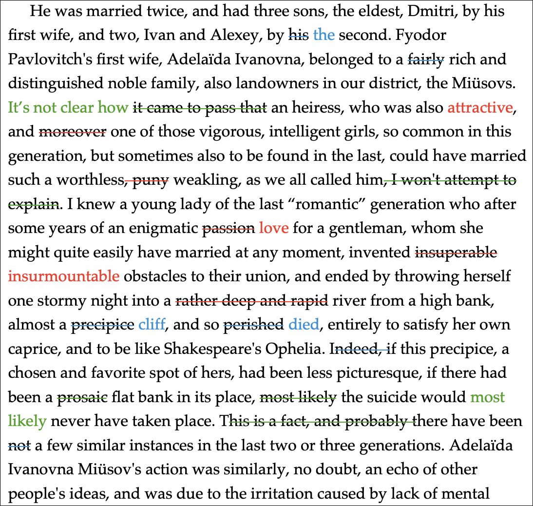 As you type new text, it appears in the revision mode color. If you want to delete existing text, the delete key removes it; however, you may want to mark text as deleted, yet not remove it from the project, so you can go revert your edits at sometime in the future. To do this, apply strikethrough formatting to the text, you want to mark. Select the text you want to delete and choose Format > Font > Strikethrough, or press Command-Shift-_ (Mac) or Ctrl+/ (Windows). In the first screenshot above, you can see a number of words with strikethrough formatting.