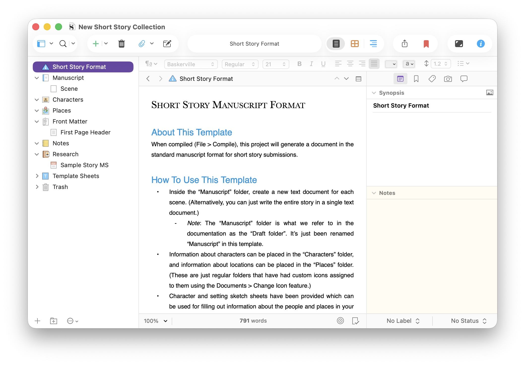 This project is ideal for any collection of short writing: stories, essays, flash fiction, or novellas. The Short Story Manuscript Format document at the top of the Binder tells you a bit about this project and how you can use it.