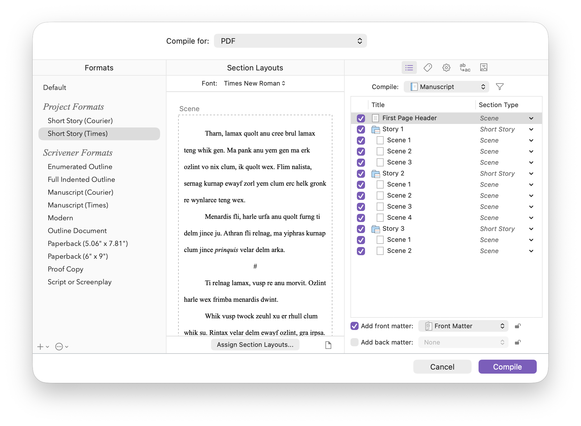 You access the Compile screen by choosing File > Compile. As you can see in the sidebar in the screenshot below, there are two Short Story formats in the Compile screen. After you’ve set up the Short Story section type, click the popup next to each story folder in the right hand pane of the Compile screen and assign that section type: