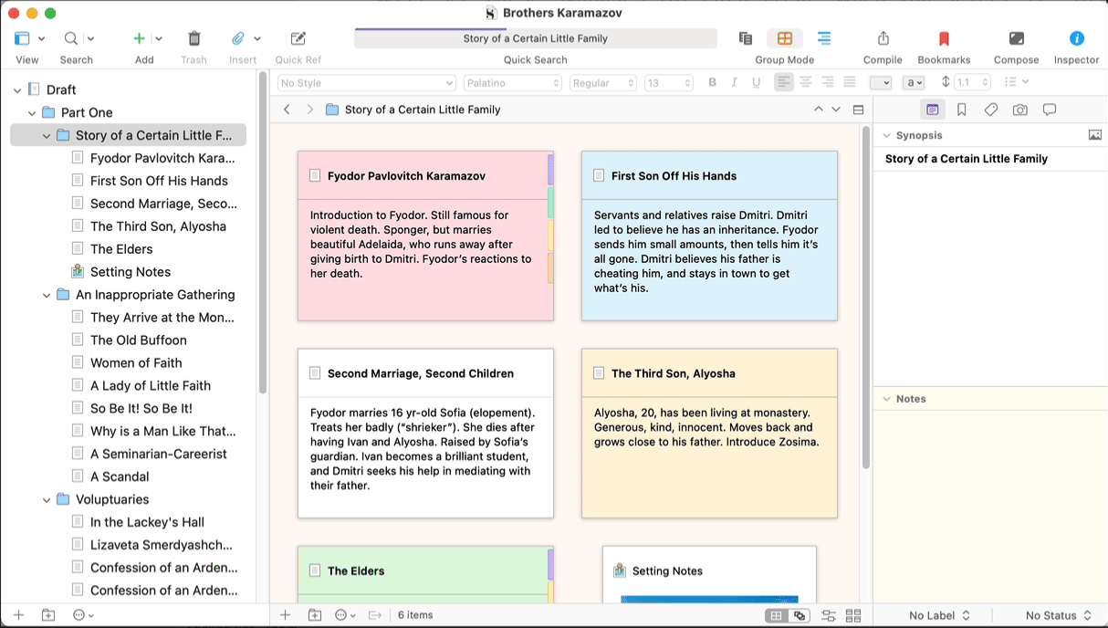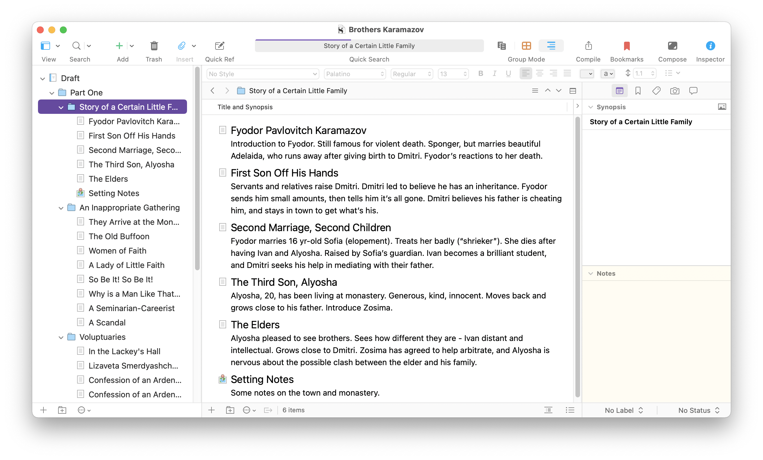 This allows you to choose any of the three views to plan and organize your project, and switch views at any time if you want to see things differently. Sometimes the Binder’s vertical, hierarchical view may be best, and at other times, the index cards of the Corkboard, especially because you can include synopses, will be appropriate. The Outliner’s synopses also help see more about your various elements, and if you add other columns to the Outliner view, these can also help you as you plan or reorganize your project.