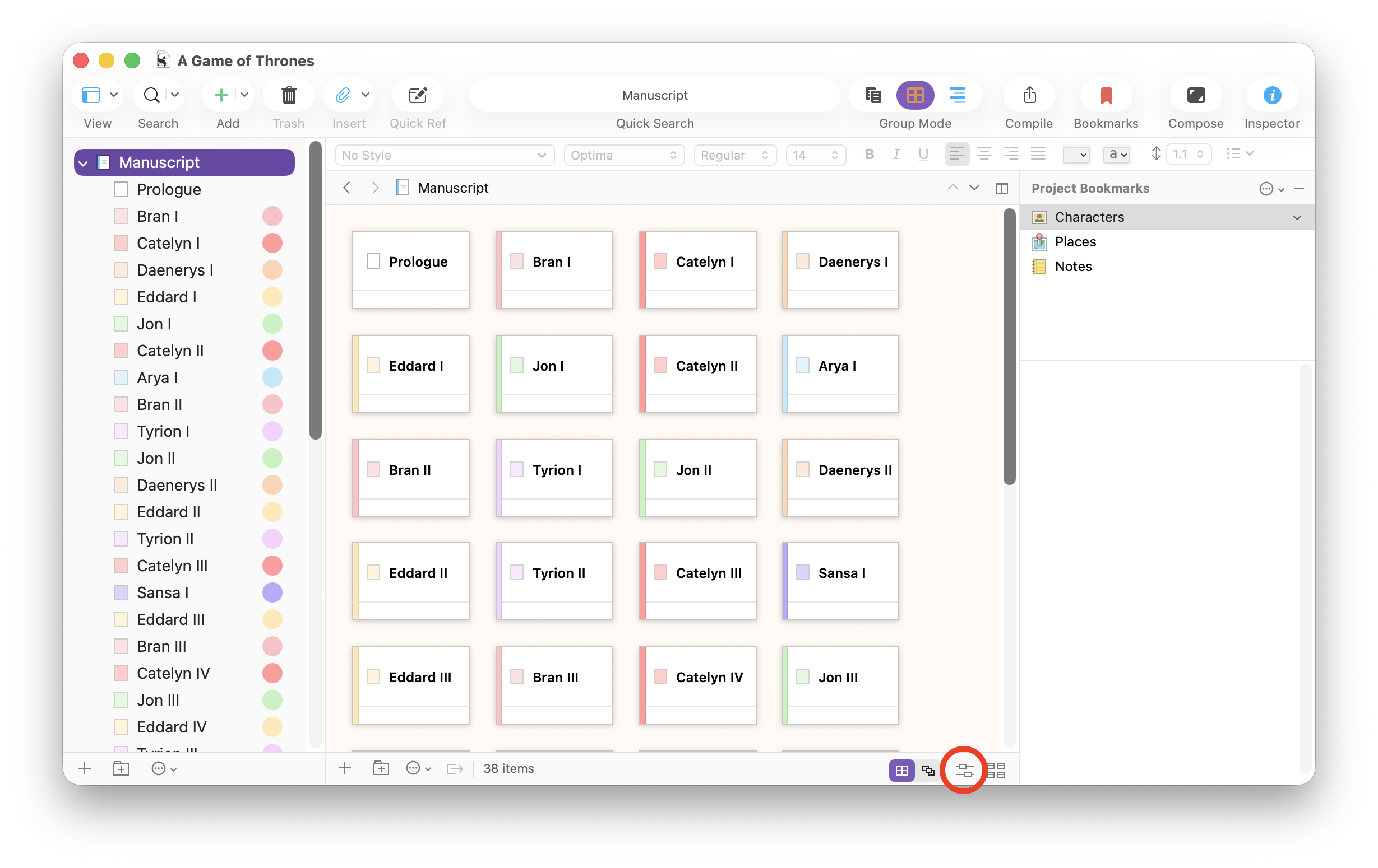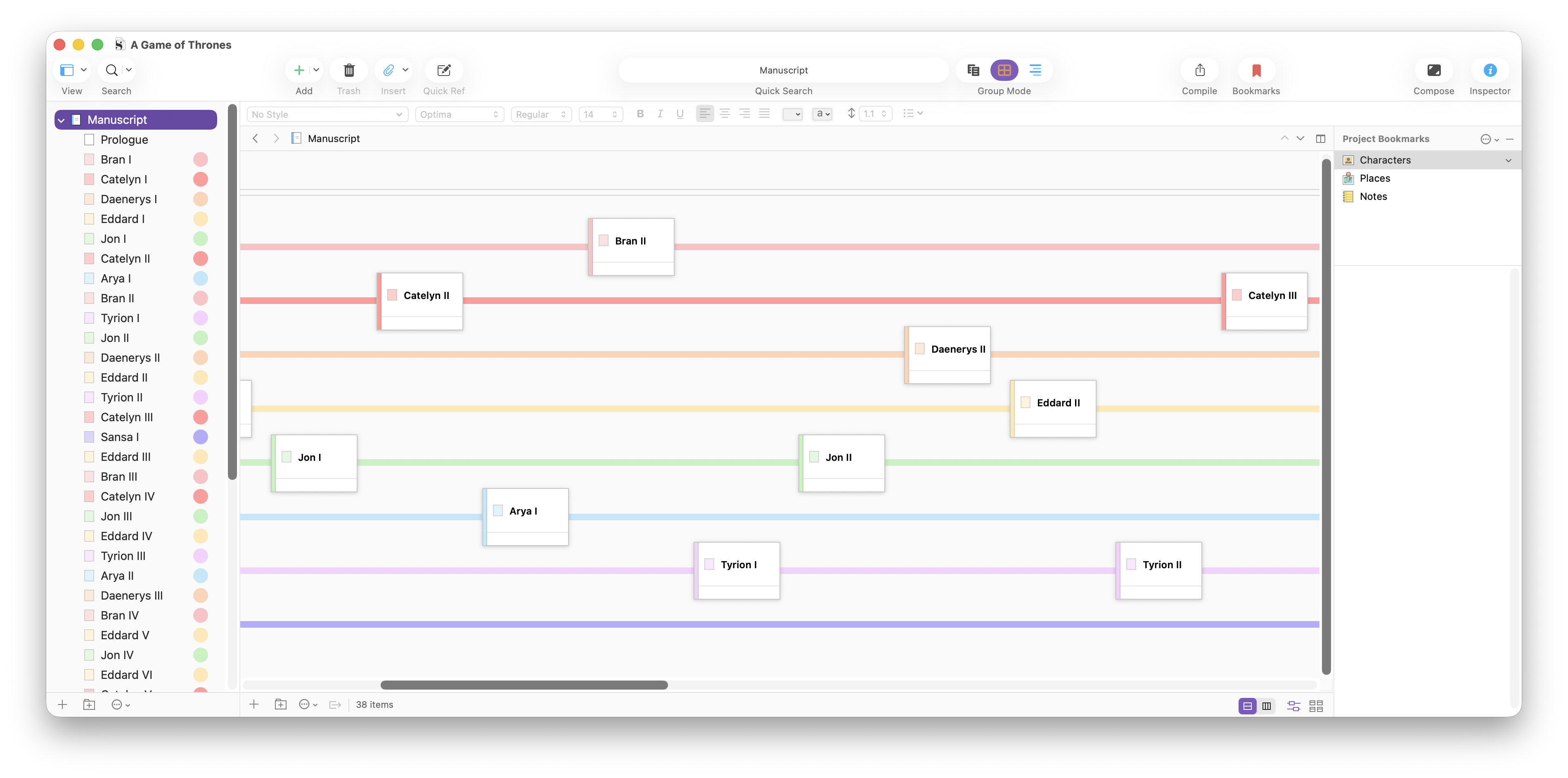 If you work with multiple point-of-view characters, it’s a good idea to mark their scenes or chapters with labels. I’ve made a sample Scrivener project with all the chapters of A Game of Thrones, named as they are in the novel: the point-of-view character’s name followed by the Roman numeral of their appearance in the story. I’ve set up labels for each character, and chosen to display them in the Binder and as Binder icons. These labels immediately show the complexity of this approach.