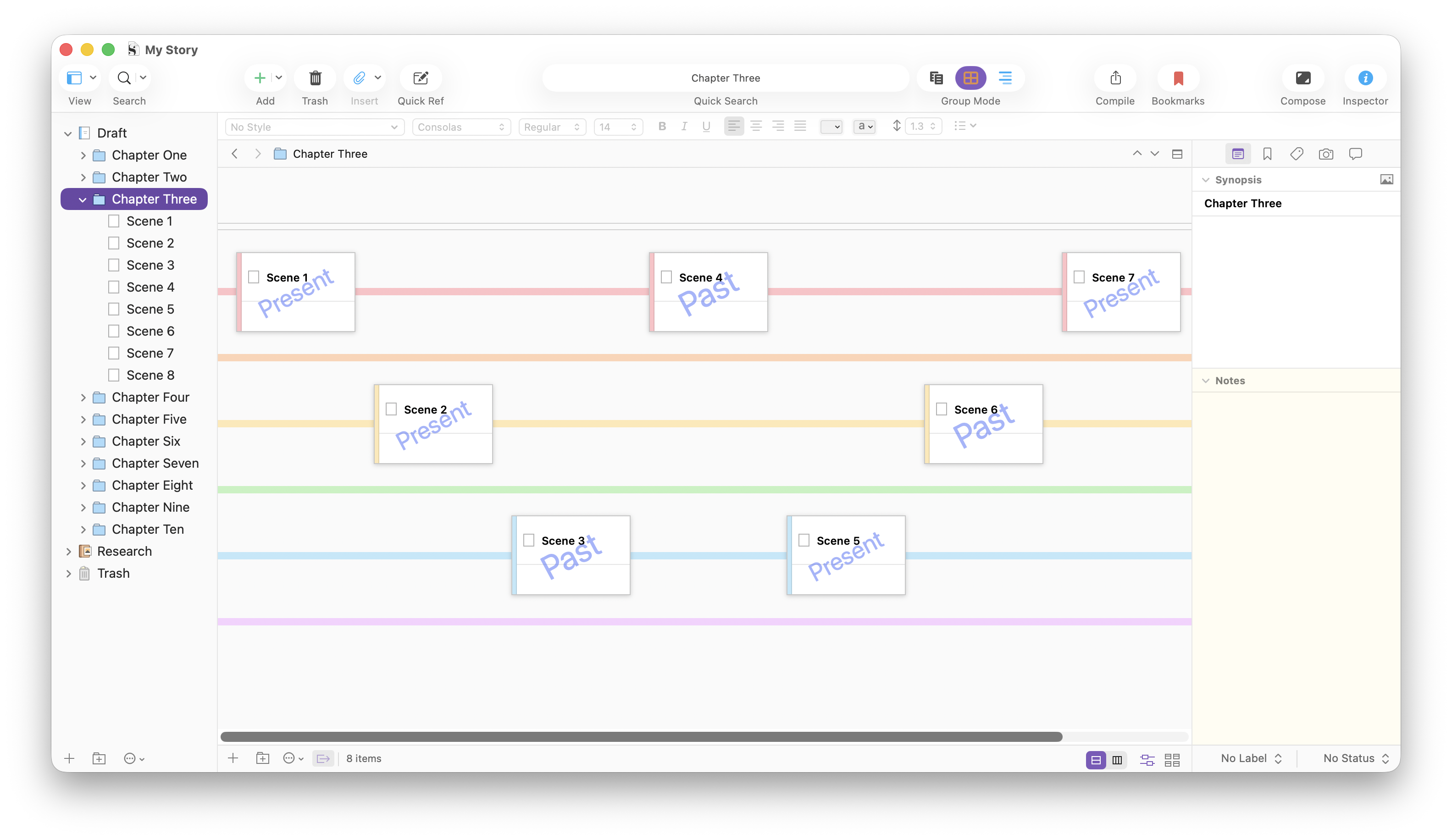 Managing multiple timelines is similar to working with multiple point-of-view characters. You can apply labels for, say, present and past, and view them in the Corkboard as above. If you have multiple past periods that you want to tag, you can create more labels. For example, you may have a character whose past is shown in childhood, adolescence, and as an adult, and you can tag each of these periods. Or the timelines could correspond to locations where characters were through their lives, with different labels used to tag different locations.