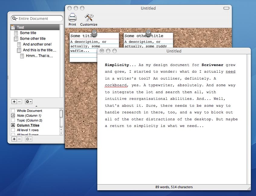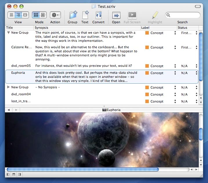 Okay, I’ve been playing around with this simplicity idea, and I’m going to experiment with it to see if it is a viable future for Scrivener. My idea is to have the main window look a little like the one in OmniOutliner. It displays either an outliner or a corkboard, with a drawer that can show the binder (yes, I know a lot of people don’t like drawers and they could put off some potential users, but I do like the way they work in OmniOutliner). You could see a document in a third pane in that window, but only as a preview and with no meta-data. Then you would open any documents you wanted to work with in a separate window. These editor windows would have a drawer for displaying meta-data, and would also allow a split view for viewing supporting documents. Here are a couple of mock-ups of how it might look: