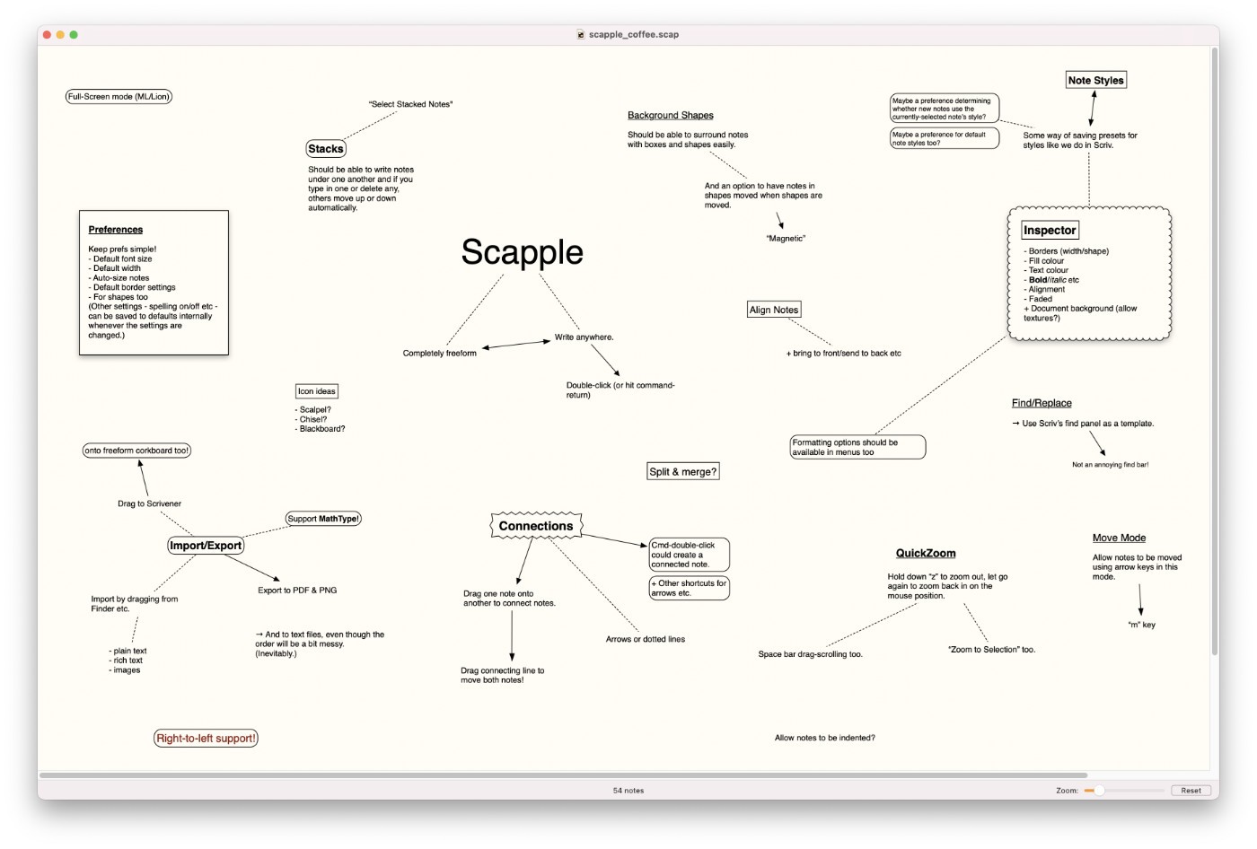 Creating notes is as easy as double-clicking anywhere on the page; making connections between ideas is as simple as dragging and dropping one note onto another. And unlike real paper, in Scapple you can move notes around and never run out of space.