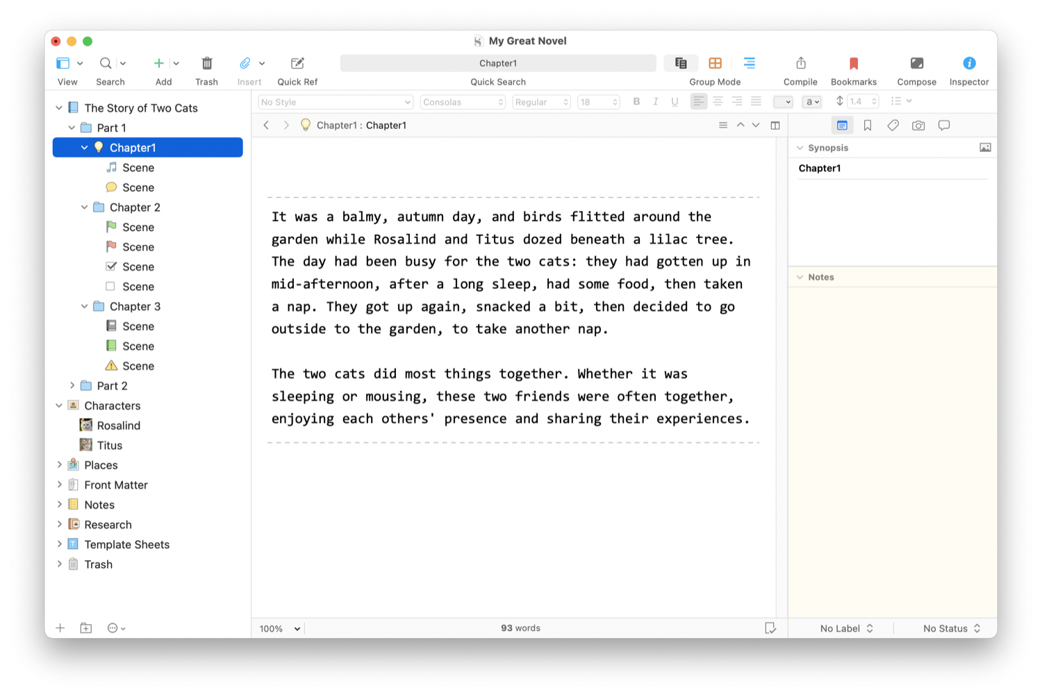 Chapter 1 has a few icons on the folder and texts that the author may find helpful to understand what each scene will contain. Chapter 2 shows two ways of using icons to indicate status. The first two scenes have green and red flags; you may want to use these to indicate sections that you have finished, need to revise, etc. Below are two checkboxes: you could have unchecked boxes for scenes to revisit, and checked boxes for scenes you feel are complete.