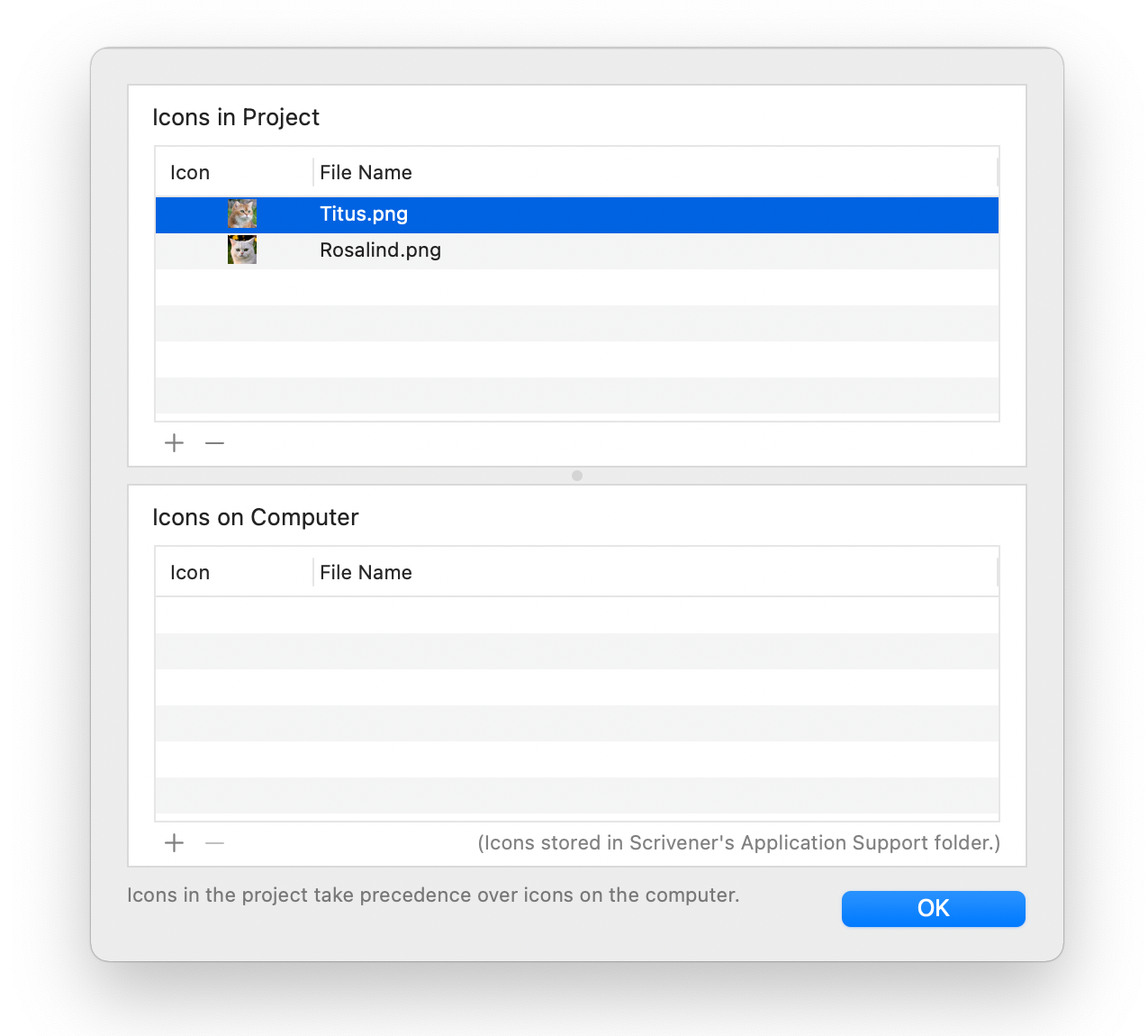 To use your own custom icons, such as photos or graphics, choose Manage Custom Icons. You can add icons here, either to your project, or to use globally in all your Scrivener projects. To add them to this project, drag them to the top section of the window; if you want them to be available in all your projects, add them to the bottom section. Icons on your computer won’t display if you view your project on another device. (Note that on Windows, you can only add custom icons to your projects.)