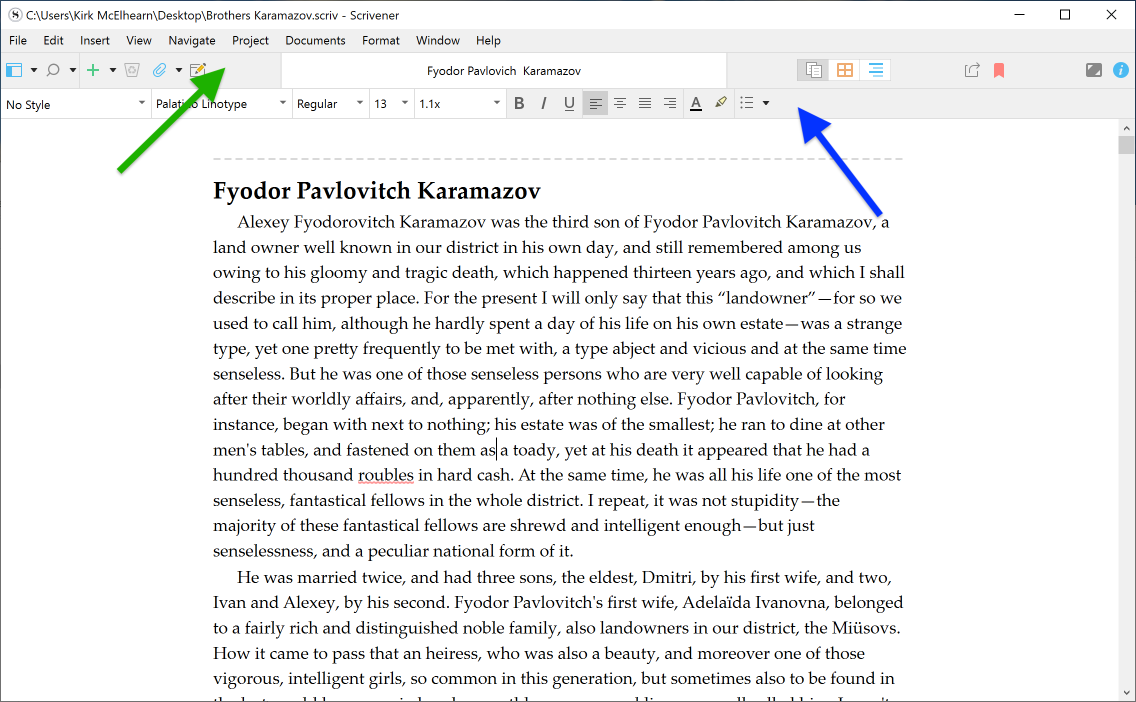 You can go further, and remove two other elements from the Scrivener window. If you choose View > Text Editing > Hide Format Bar (Mac), or View > Text Editing > Format Bar (Windows), you can remove the Format Bar, indicated below with a blue arrow. And View > Hide Toolbar (Mac) or View > Toolbar (Windows) hides the toolbar, indicated by a green arrow.