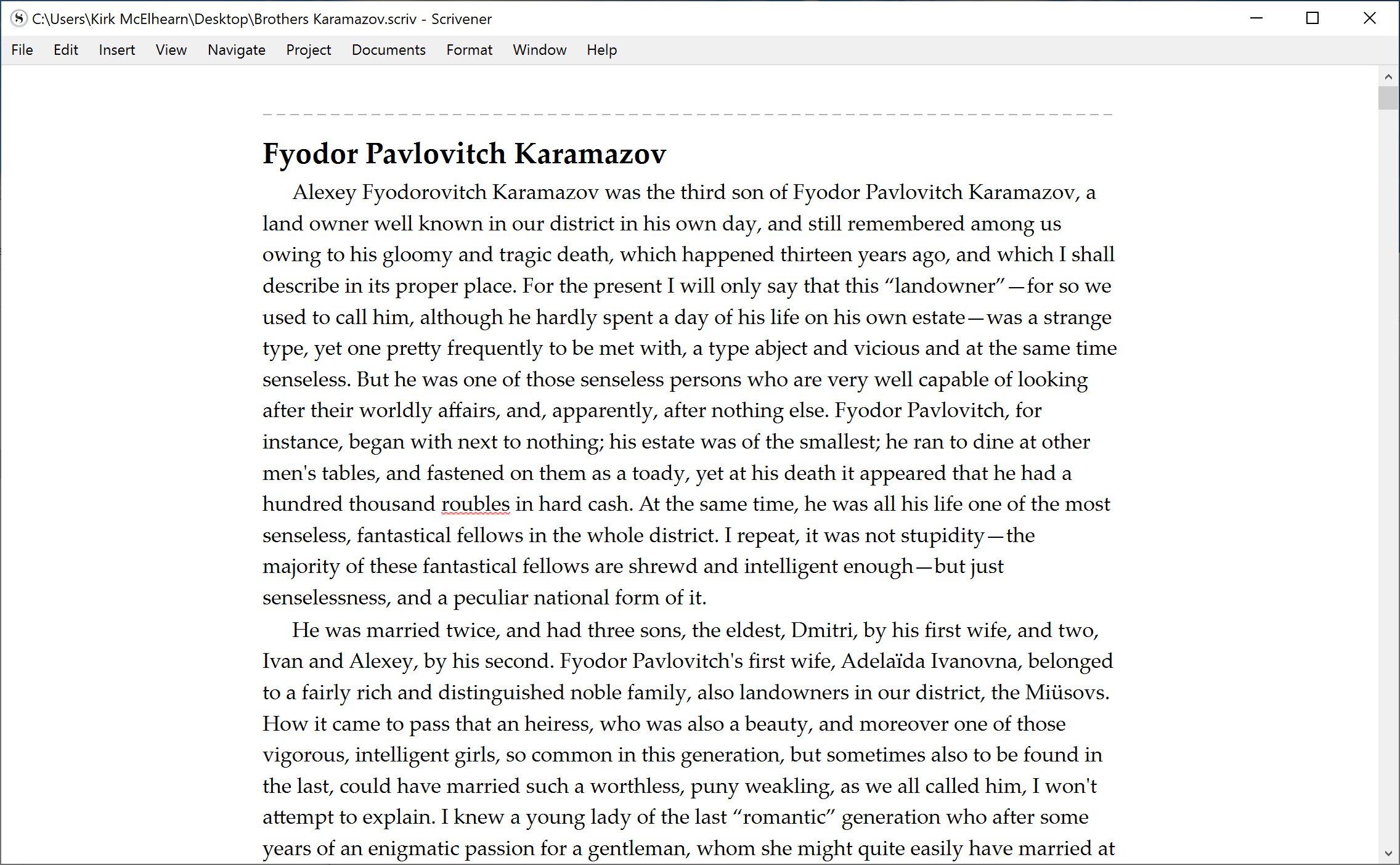 You may find this to be a comfortable way to work with Scrivener, at least when you’re writing. When you’re editing your work, you may want to have some or all of the elements visible. Remember, each of these elements is just a click or a keyboard shortcut away.
