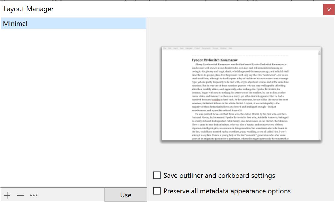 After you’ve tweaked the window to your desired settings, choose Window > Layouts > Manage Layouts. Click + at the bottom of the window, and name your layout. Scrivener saves the window settings, which you’ve adjusted as described above, and shows a screenshot.
