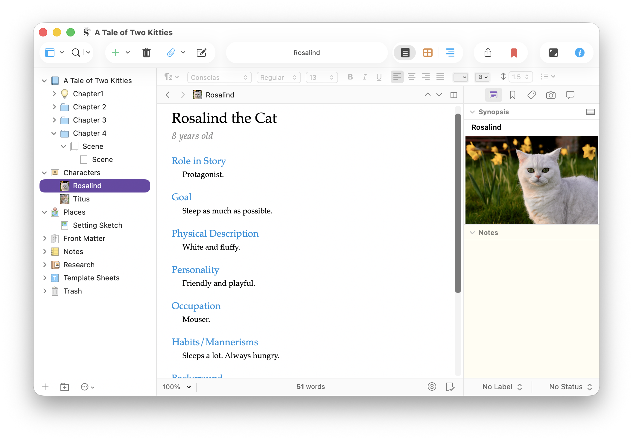 While the headers in these documents guide you in suggesting elements to describe your characters, you’re free to add any notes you want in these character sketches. If you don’t like the way they are set up, you can create your own document templates with layouts and headers that are more adapted to your project. (See How to Create and Use Custom Document Templates in Scrivener.)