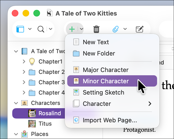 Some people write books with just a few characters, and others may have hundreds. George R.R. Martin’s A Song of Ice and Fire series has some 2,000 named characters, divided among “houses,” and the relationships between characters are complex. If you were writing this sort of novel, you might want separate Characters folders for each house; or for a space opera, one folder for each planet. If you’re writing a biography or a historical novel, you may also want to separate characters into folders to make them easier to manage. Or you may simply want to have different character sketches for major and minor characters.