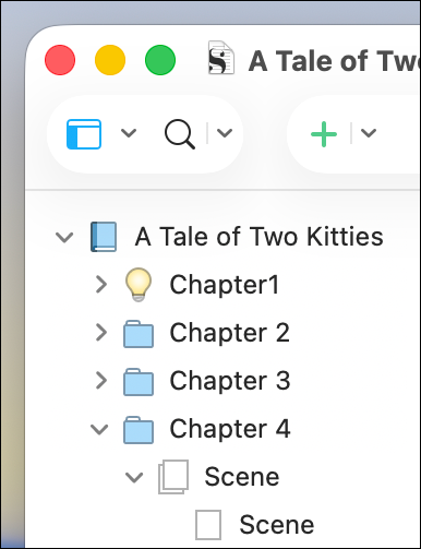 You’re used to seeing files in Scrivener’s Binder in folders, and this is the standard way you organize your project. But Scrivener also uses file groups, which are files that contain other files. You can see how this works by dragging any file onto another file; the second file shows as a child of the first file, indented in the Binder. You can see this below, where one scene is a child document of another scene in Chapter 4 of a project.