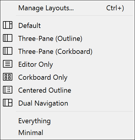 The Mac version of Scrivener shows a number of useful built-in window layouts by default this menu. You can display these in the Windows version by unchecking Hide Built-In Layouts in the Options (…) menu. This is a feature that is still a work in progress in the Windows version of Scrivener.