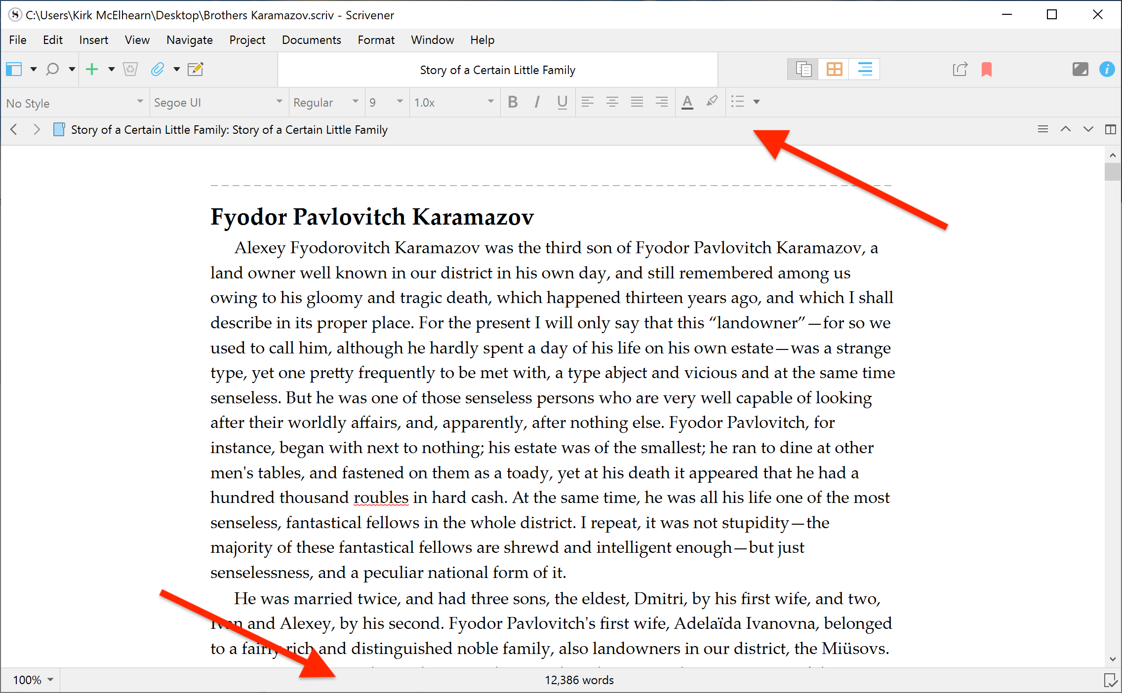 You can go further, and remove two other elements from the Scrivener window. If you choose View > Text Editing > Hide Format Bar (Mac), or View > Text Editing > Format Bar (Windows), you can remove the Format Bar, indicated below with a blue arrow. And View > Hide Toolbar (Mac) or View > Toolbar (Windows) hides the toolbar, indicated by a green arrow.