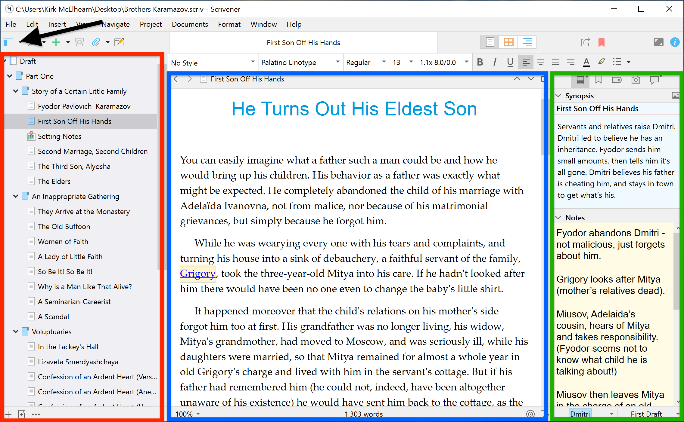 From left to right, the three main elements of the Scrivener window are the Binder, the Editor, and the Inspector. In the screenshot below, the Binder is outlined in red, the Editor in blue, and the Inspector in green.