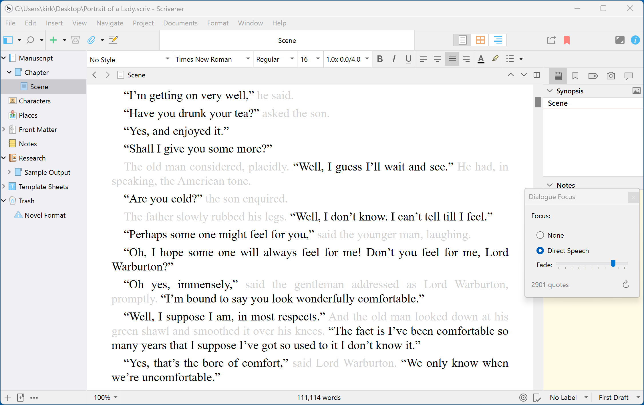 To use this, choose Edit > Writing Tools > Linguistic Focus (Mac) or Edit > Writing Tools > Dialogue Focus (Windows). Click Direct Speech, and Scrivener dims all the text that is not in quotes. Here is a section from Henry James’s A Portrait of a Lady: