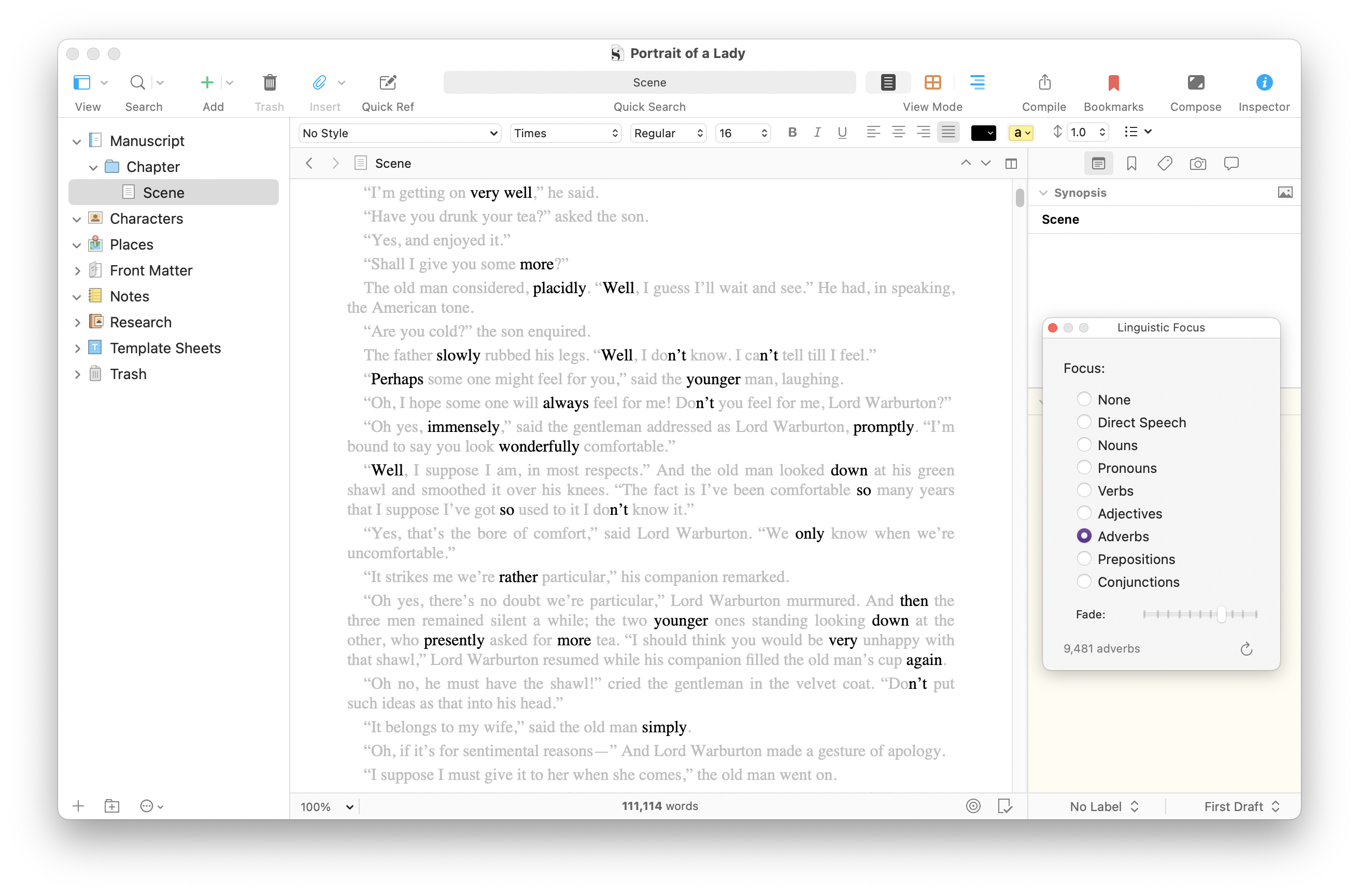 Scrivener’s Dialogue Focus and Linguistic Focus tools let you view your work differently, and aid in revision and editing.