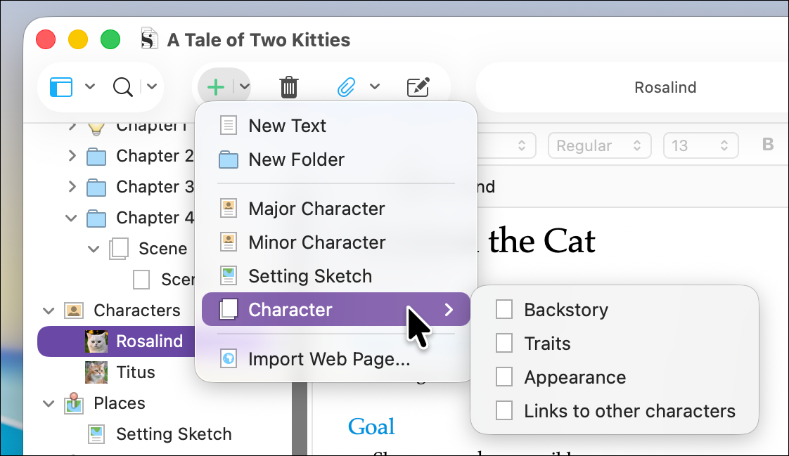 But these character sketches may not be sufficient for your project, and you may want to flesh out your characters in detail before writing. Scrivener lets you create custom document templates that you can use for characters, and you can even create cascading character templates so you can create new file groups as character sheets quickly.